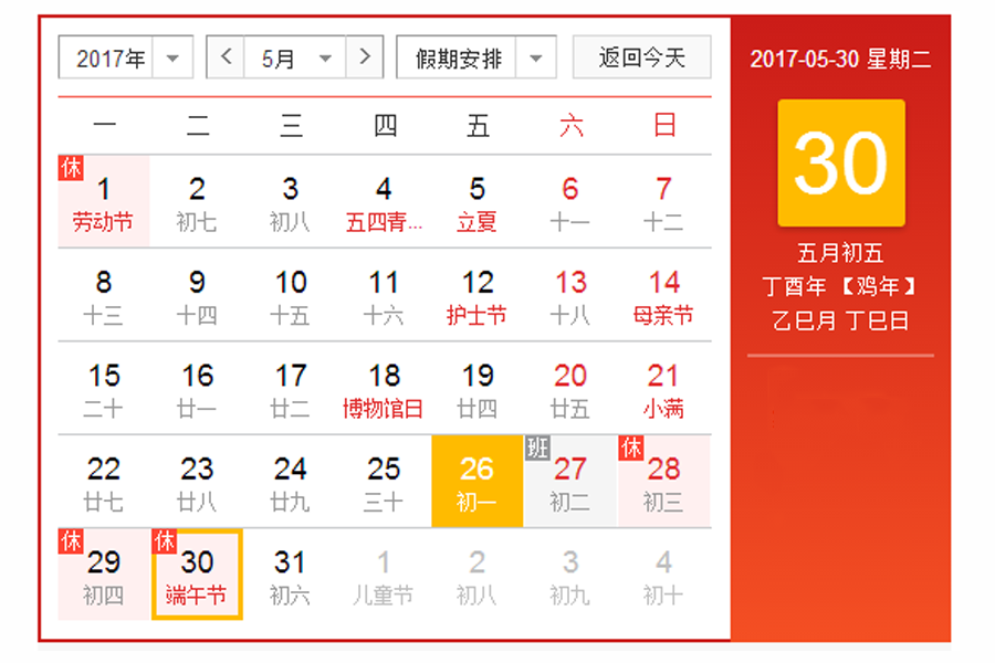 端午節(jié)即將來臨,端午節(jié)是我國最大的傳統(tǒng)節(jié)日之一。根據(jù)國務院辦公廳有關文件精神,2017年端午節(jié)放假時間安排如下: